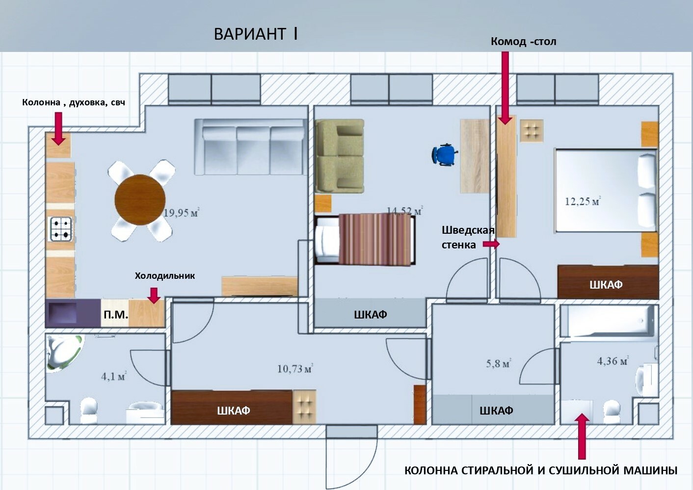 В данном случае типовая планировка от застройщика не лучший вариант, поэтому я предложила 3 возможные планировки, включая расстановку мебели с учетом пожеланий заказчика. Данные планировки легко реализовать и узаконить. Стены в квартире не возведены, их несложно перенести, при этом мы соблюли все мокрые точки и инженерные коммуникации.