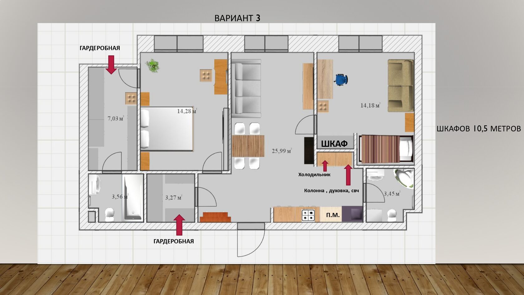 В третьем варианте мы разделили площадь квартиры на три зоны. Первая это родительская спальня со своей гардеробной и санузлом. Вторая зона для ребенка. Между ними проходная гостевая зона 25,99 м ². Площадь для хранения увеличилась до 10,5 метров. Увеличение сделали за счет санузла и выноса зоны кухни в холл.