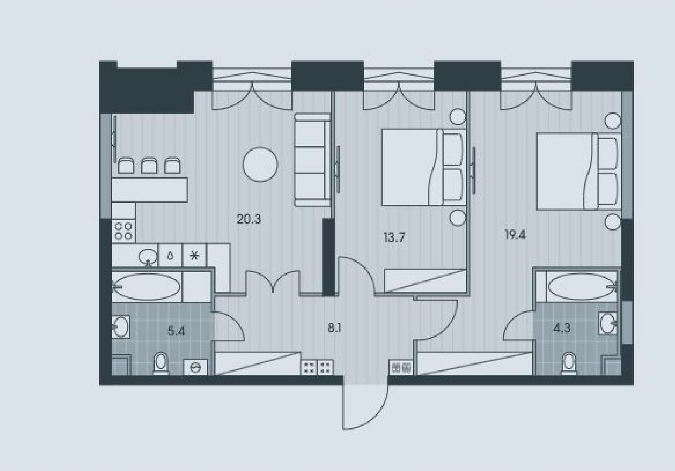 В первом варианте мы разделили квартиру на 2 зоны. Первая зона — это спальни со своим санузлом, где располагаются стиральная и сушильная машинки. Вторая зона гостевая с кухней, где есть возможность готовить и встречать гостей. Вход в гостевой санузел из холла. При такой планировке зона хранения увеличилась на 3 метра.