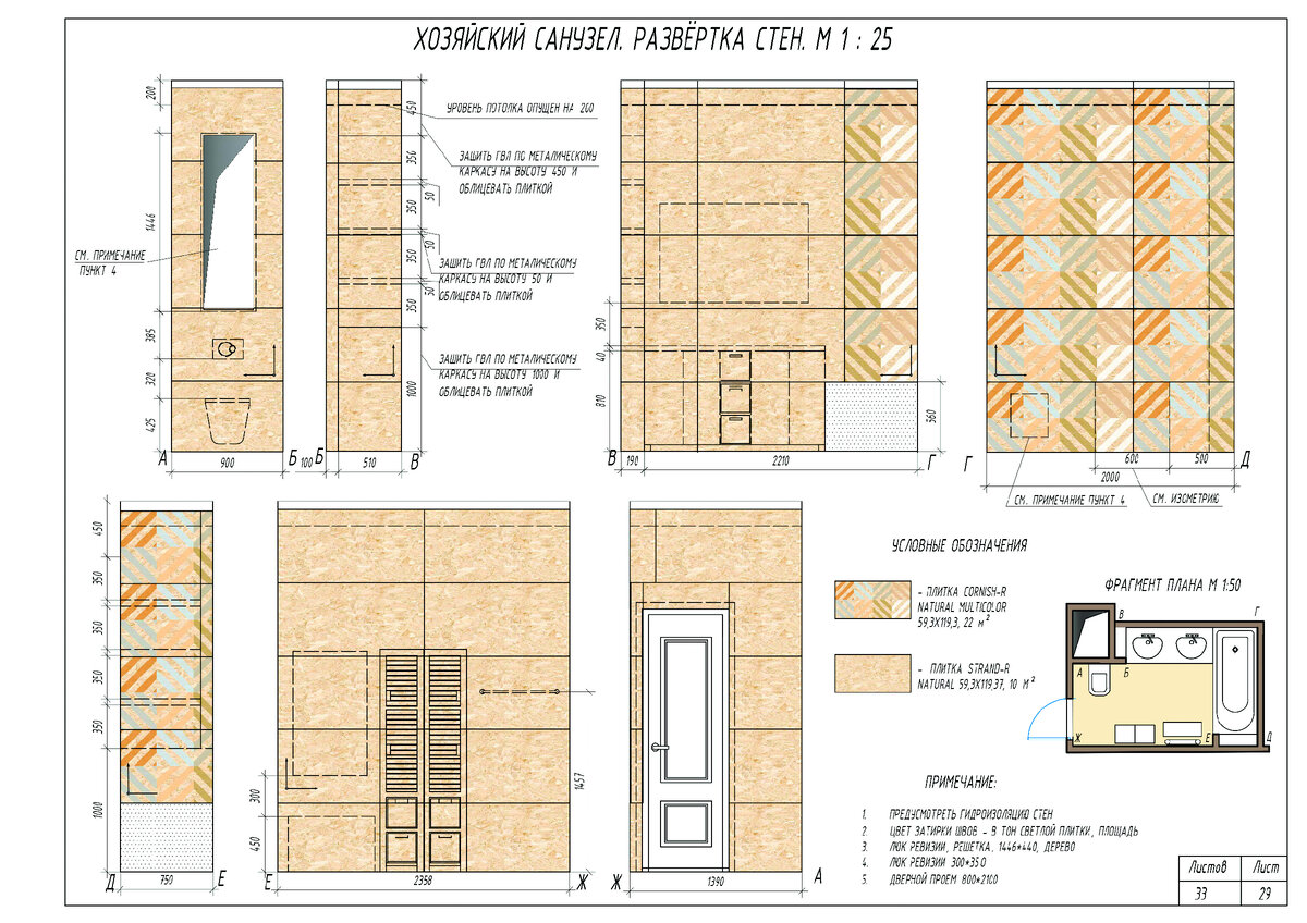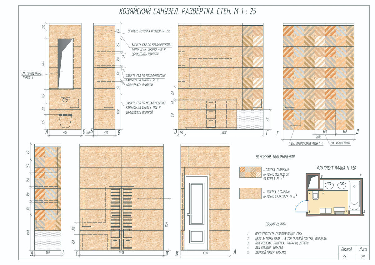 Убедитесь в том, что крепления кранов, крючков и других элементов симметричны относительно плитки и не попадают в швы. Учтете еще тысячу нюансов, которые создают общее впечатление от помещения, ведь на развертке вам будет видна каждая мелочь. А также упростите задачу кафельщику и спасете свои нервы, если он решит укладывать плитку по своему вкусу. Заказать развертку плитки по стенам вы так же можете на моем
