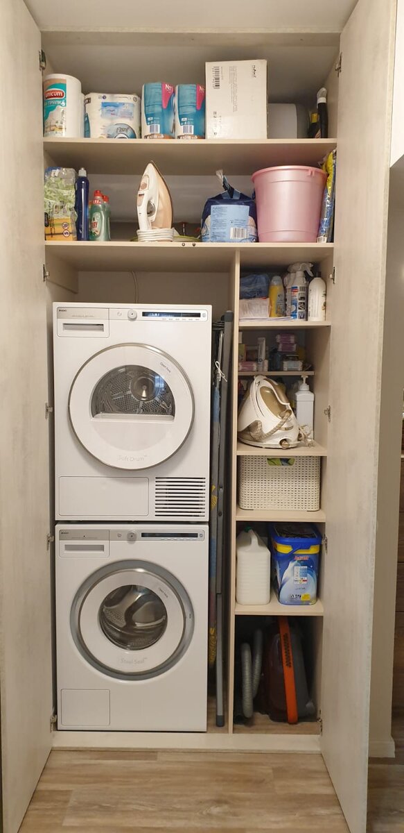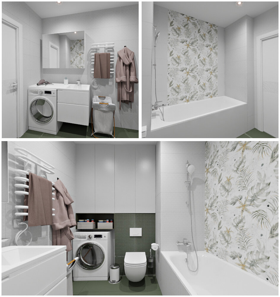 В этом проекте мы вынесли в коридор стиральную и сушильные машинки и организовали хозяйственный блок.