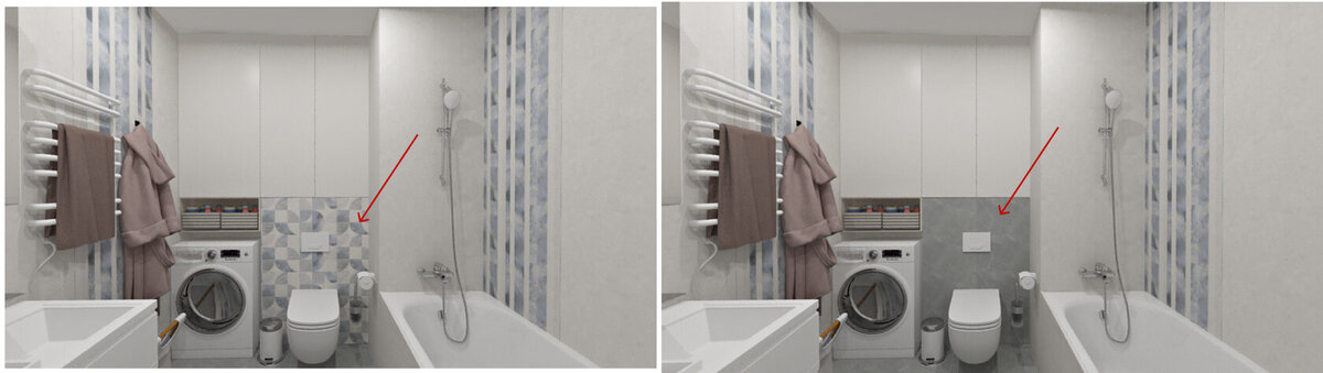 - Если в облицовке ванной вы используете плитку одного формата, обязательно проверьте раскладку. Швы на стенах и полу должны совпадать. Несостыковки испортят весь внешний облик санузла. А вот в случае с плиткой разного размера совпадение швов не обязательно.