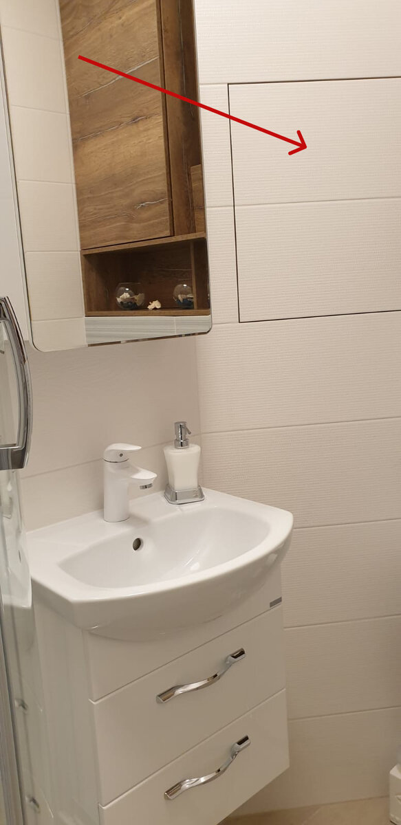 Инженерные сети спрятаны в шкафчике за кафельной плиткой.