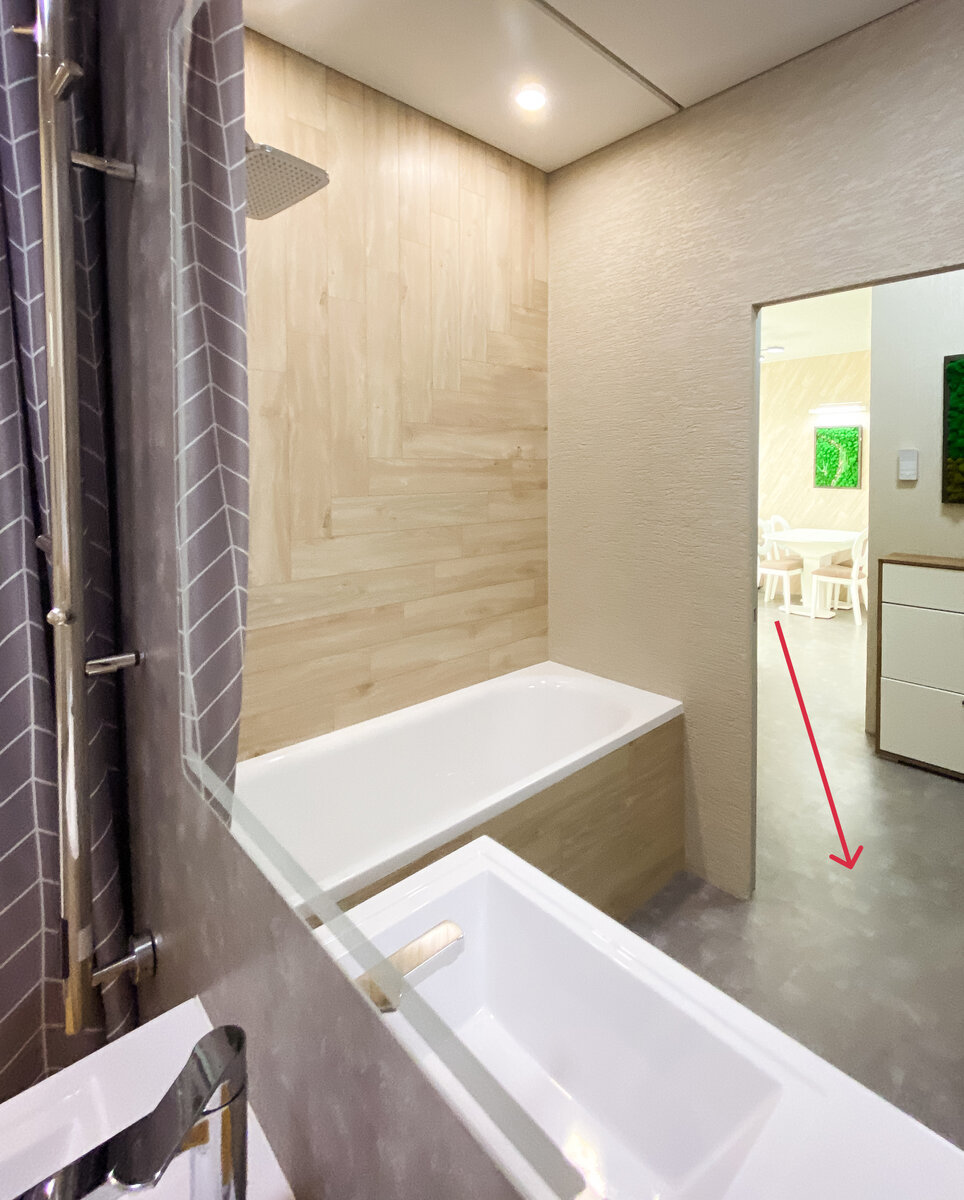 В этом проекте у нас порога в ванной комнате нет, но так как площадь квартиры небольшая, то гидроизоляция по всей площади квартиры.
