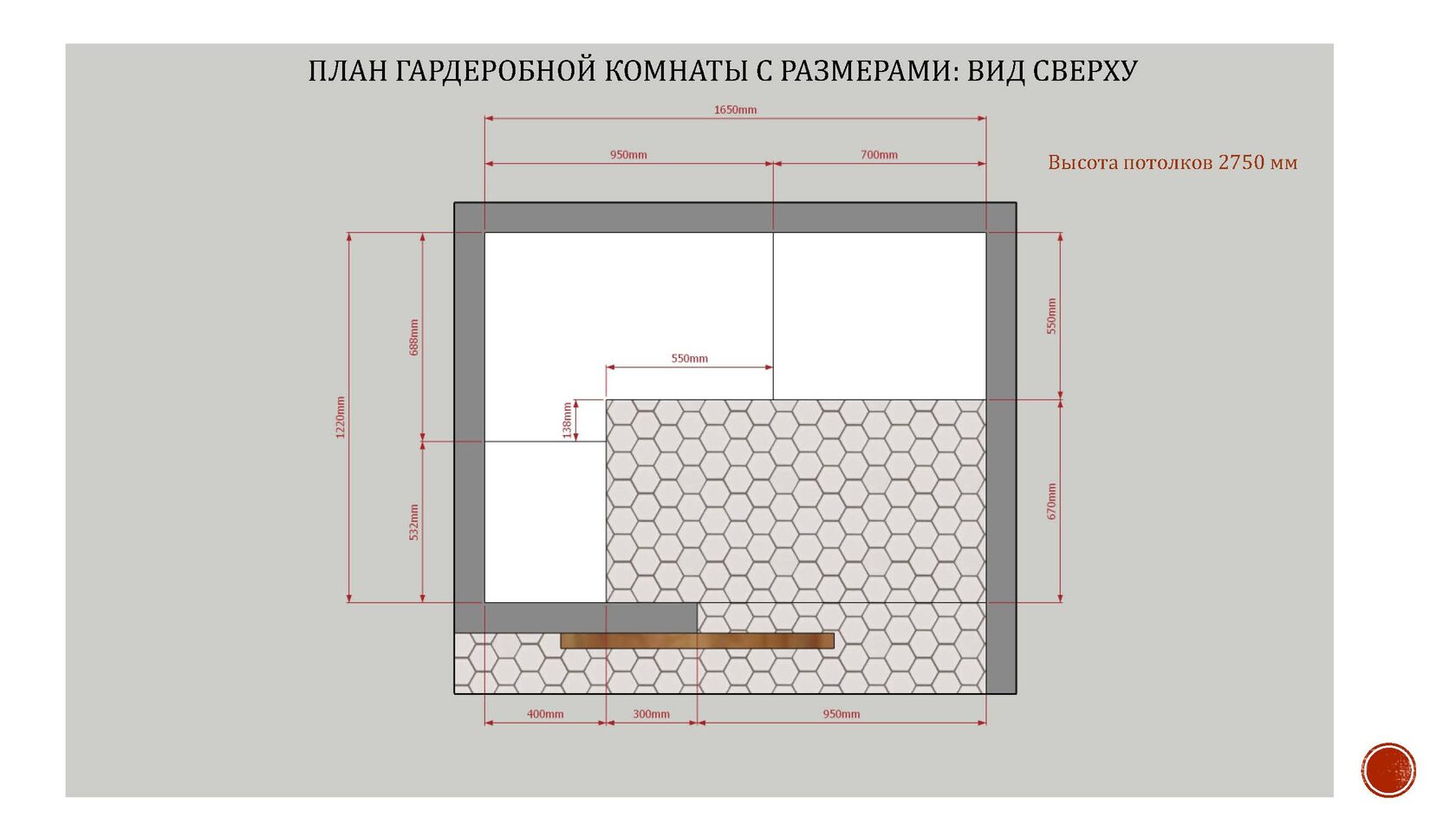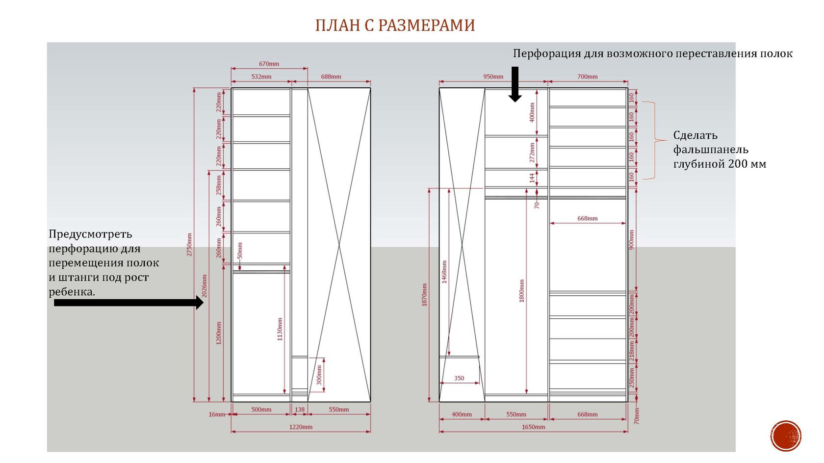 На рисунке представлен план гардеробной с размерами, где мы предусмотрели перфорацию для перемещения полок и штанги под рост ребенка.