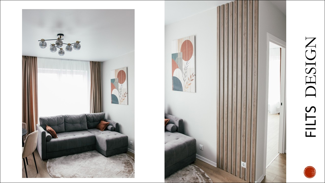 Круглый ковёр и рейки на стене — грамотное зонирование.