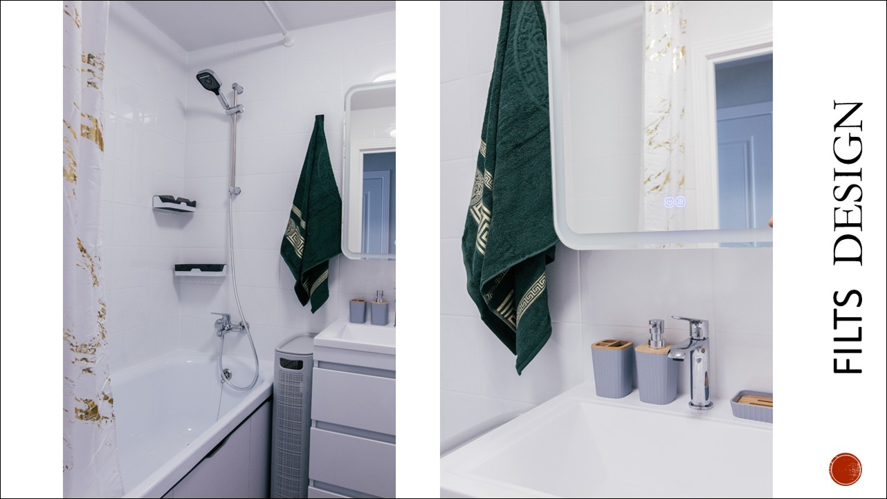 - Зеркало с подсветкой и аксессуары в едином стиле создают целостность.