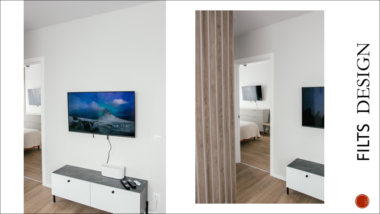 Минималистичная ТВ-тумба поддерживает общий стиль.